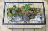 4 | 陸地に植物を植える。水辺に棲息するものを植えたかったが、今回は室内で照明装置も使用しないため、ユキノシタ、シダ等の比較的弱い光でも育つものにした。 |