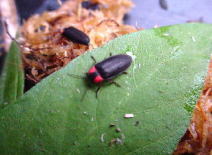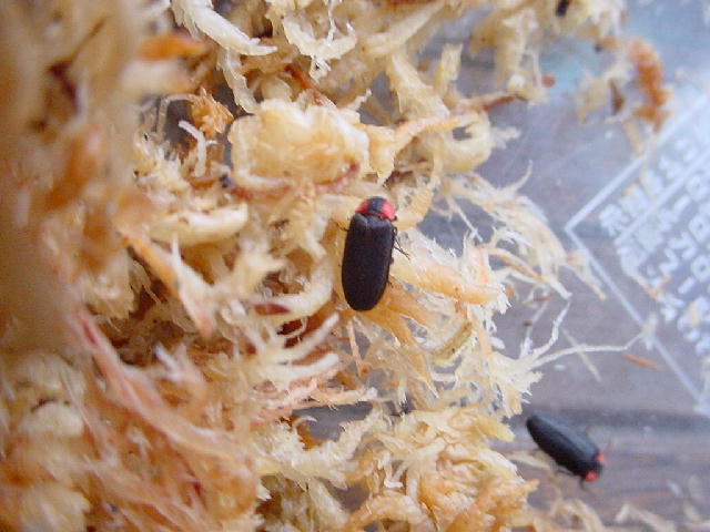 ![]() 成虫になったホタルは餌を食べない。水分だけを絶やさないように、飼育ケースに入れたミズゴケに霧吹きで水をかけてながら飼育した。(成虫での生存期間は約1週間) ホタルは昼間はこのこのミズゴケの中に隠れている。夜間になると活発に動き始めるが、わずかな隙間からも出てしまうので、飼育ケースにはしっかりふたをしたほうがよい。 |