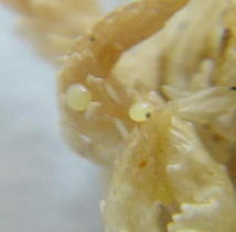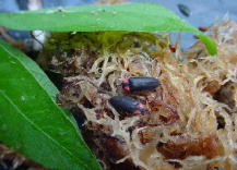 産卵日は不明であるが、今年は気温が高いためそろそろ孵化の時期である。しかし、数日前から 水の中を見ても落ちているのはミズゴケからのゴミばかりである。この日も同様 であったため、水換えを行うことにした。ざるをはずして水をもう一度見てもやはりゴミばかりである。ところが、念のためゴミと思われるものをスポイトで取り出してひとつひとつルーペで見ると、1ミリもない黒い粒2つは幼虫であった。スポイトで取り出した水滴の中でわずかに動く幼虫に感動!!!水換えは中止。2匹を水に戻し、もうしばらく様子を見ることにした。 |
