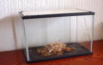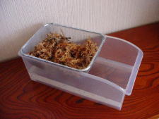ホタルが飛ばなくなってからミズゴケをよく見ると、数個の卵がついていたため、孵 化の準備をした。100円ショップで四角のざると調味料用半透明のケースを購入して、右写真のように重ねる。 ざるには飼育ケースに入っていたミズゴケをのせ、下のケースには水を3cmほど入れる。無事孵化すれば、幼虫は水の中に落ちてくる。 |