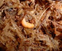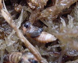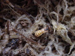 | 数匹羽化したとき、成虫のようすを見るため隠れ家および産卵場所として入れた水苔を持ち上げて見ると、苔の下や苔の中に蛹がいた。水苔があると土にもぐらなくても蛹になれることがわかった。蛹は、まだ幼虫に近いもや間もなく羽化しそうなものなど、その形が様々である。 工夫すれば、土を使わずに蛹の飼育ができるのでは・・・。 |