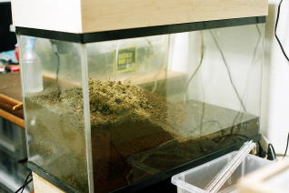 | 平成17年6〜7月、幼虫は徐々に上陸し、土の中で蛹に姿を変えている。早い時期に上陸した幼虫は、7月初旬には成虫になるため、陸上には成虫のために水苔を置いた。 |