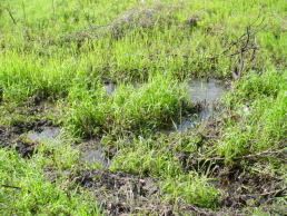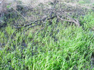 | 平成18年4月8日、ホタルが生まれた場所を見に行った。この時期は草が短いため、湿地の様子が良くわかる。 この場所の南側は斜面になっており、その周辺は常に水がたまっている。そのため、最近の水田は農閑期に水はなくなってしまうが、、ここには1年中水があると思われる。 |