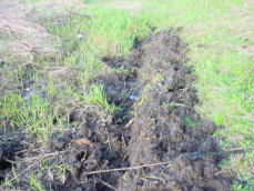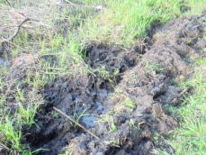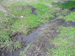 平成18年4月30日、放流予定場所へ行って見たら、水位が全体的に下がり、所々に水があ る程度であった。水たまり拡張のための溝堀りを数回行なったことが逆効果になってしまったようである。水分を多く含むやわらかい場所意外にも水が流れ込むようにしたが、流れ込んだ水を吸収していまい、水がたまらなくなってしまった。そこでせっかく掘った溝であるが、水の流れを止めるための作業を行なった。 |