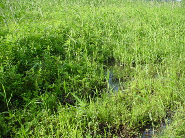 平成18年5月5日、ヨシやその他の草花がかなり伸びてきた。ヨシ原はクモが巣を作りやすく、ホ タルにとっては危険な場所となると聞いたことがある。そこで、湿地周辺の草刈りを行なった。(すぐ伸びてきてしまうと思われるが・・・・)一度減ってしまった水は再びたまり始め、なんとか放流できそうな場所になってきた。作業中に通りかかった人から、「ここは1年中水があるから・・・。」という話を聞 き、常に水を蓄えている場所であることを再確認できた。放流は、6月に行なう予定である。放流予定数は、400〜500匹。 |