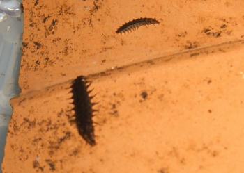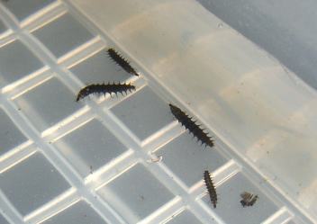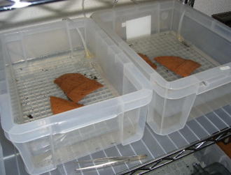 | 現在、8つの飼育槽で幼虫を飼っている。 | 1つの飼育槽には200〜300匹の幼虫が入っている。 |