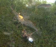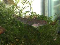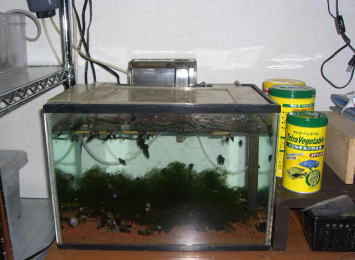 餌の貝を飼育している水槽には、カワニナ、タニ シ、シジミが入っている。その他に、貝と一 緒に捕ってきたヨシノボリやスジエビもいる。 |