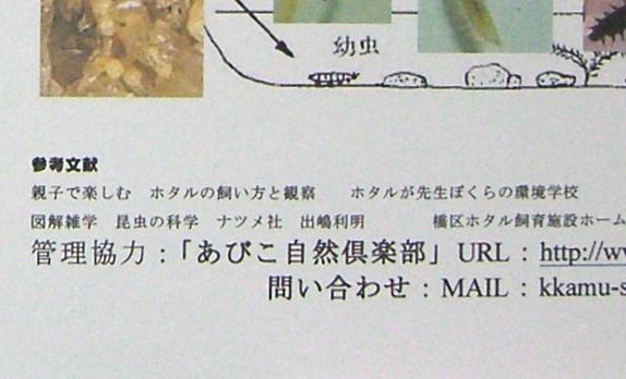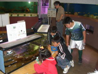 手賀沼親水広場の水の館に、ホタルの飼育水槽がある。これは、「 あびこVideo」が所有・管理していたものである。その後、水の館に寄贈され、「あびこ自然倶楽部」が管理に協力することになった。平成18年11月19日、管理の仕方について打ち合わせを行なう。 平成18年11月26日、水槽の点検、エサやり、解説用パネルの取りかえを行なう。 ・ ・ ・ 今後も、水の館を訪れた多くの方々に、ホタルの生態や環境保全の大切さ等を理解してもらえるように努めていきたい。 |