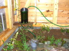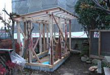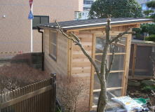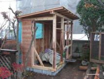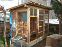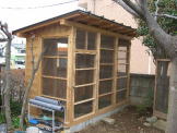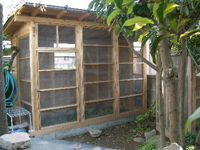 | 1 小屋づくり 平成18年11月、市内の大工さんに相談。予算や「小屋に隙間がないこと」、「全面及び側面の2/1以上はステンレスの金網にすること」等の条件を伝え、12月6日から工事開始。 できあがった小屋は、頭の中で描いていた以上のものとなり、「さすがプロ!」と思える仕上がりに満足している。また、要望に対しての細かな気配りや、工程途中での希望変更の受け入れなど、こちらからの希望通りに対応してくれた大工さんに大変感謝している。 |