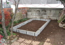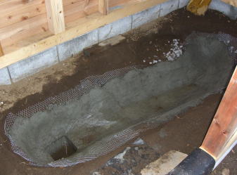 | 2 池づくり ここからは、自分で行った。今回の小屋内の池はビニールシートではなく、モルタルで作ることにした。モルタルを使う作業ははじめてであり、戸惑うことが多く、やり直しをする箇所もあったが、無地アク抜きまで終了。 |