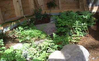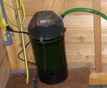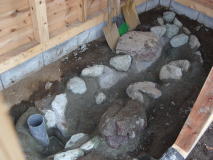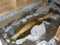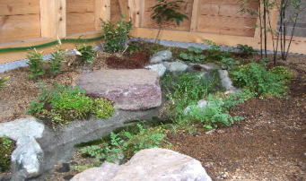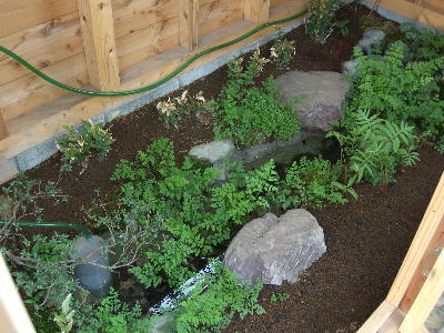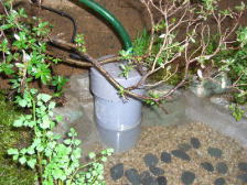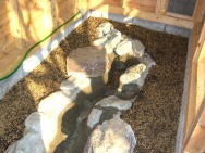 ![]() 4 水づくり池には、硅砂と黒那智石を入れた。また、砂利による浄化を補うために、水を水中ポンプで池の最低部から浄化フィルターへ導水し、循環させている。 |