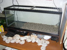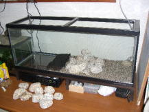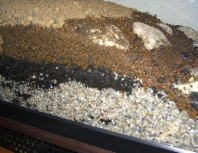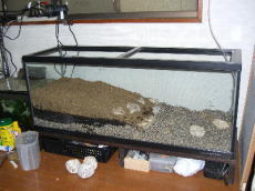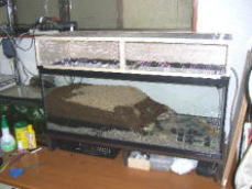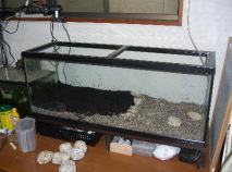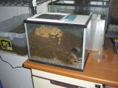 平成19年5月6日![]() 幼虫は間もなく蛹になる時期を迎える。 昨年は、新たな上陸用水槽を作らずに、前年のものを使用したところ、羽化率が低かった。また、上陸前に死んでしまう幼虫も多かった。死因は、カビ等の真菌類である。そこで、今年は新たに上陸用水槽(90cm水槽)を作り変えることにした。 上陸部分には、赤玉土をベースにして、保水性・通気性に優れ、防カビにも配慮した用土を特別に配合(赤玉土+富士砂+その他)した。 |