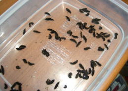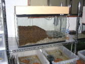 平成19年5月 25日![]() 上陸用水槽(60cm水槽)をもうひとつ作り、幼虫を100匹入れた。 夜間に、発光しながら上陸を試みる幼虫を確認した。 平成19年6月23日 ![]() 上陸用水槽(30cm水槽)を追加し、幼虫を40匹入れる。 |