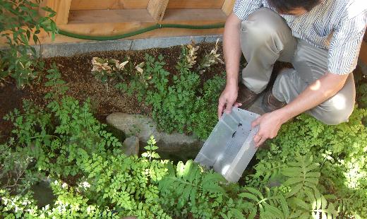 | 大きく育った幼虫を150匹放流した。土の乾燥が思ったより早いので、真夏には散水を忘れないようにしなければならない。 | ||