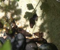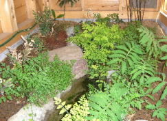 | 池の周りの植物は大きくなってきたが、これから遮光によって育ちが悪くなる可能性がある。 池の中には、カワニナとメダカが入っている。 |