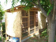 家の周辺には大きな建物、街灯、夜間に点灯する道路標識等があり、明かりが庭を照らしている。自動車のライトも当たり、これらの光は、羽化後の行動に影響してしまう。そこで、小屋の周りの樹木はしばらくの間剪定しないことにした。また、ヨシズを張り、できるだけ小屋に光が当たらないようにした。 |