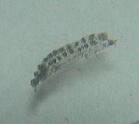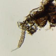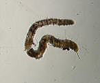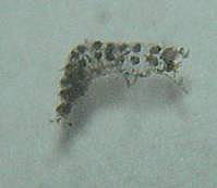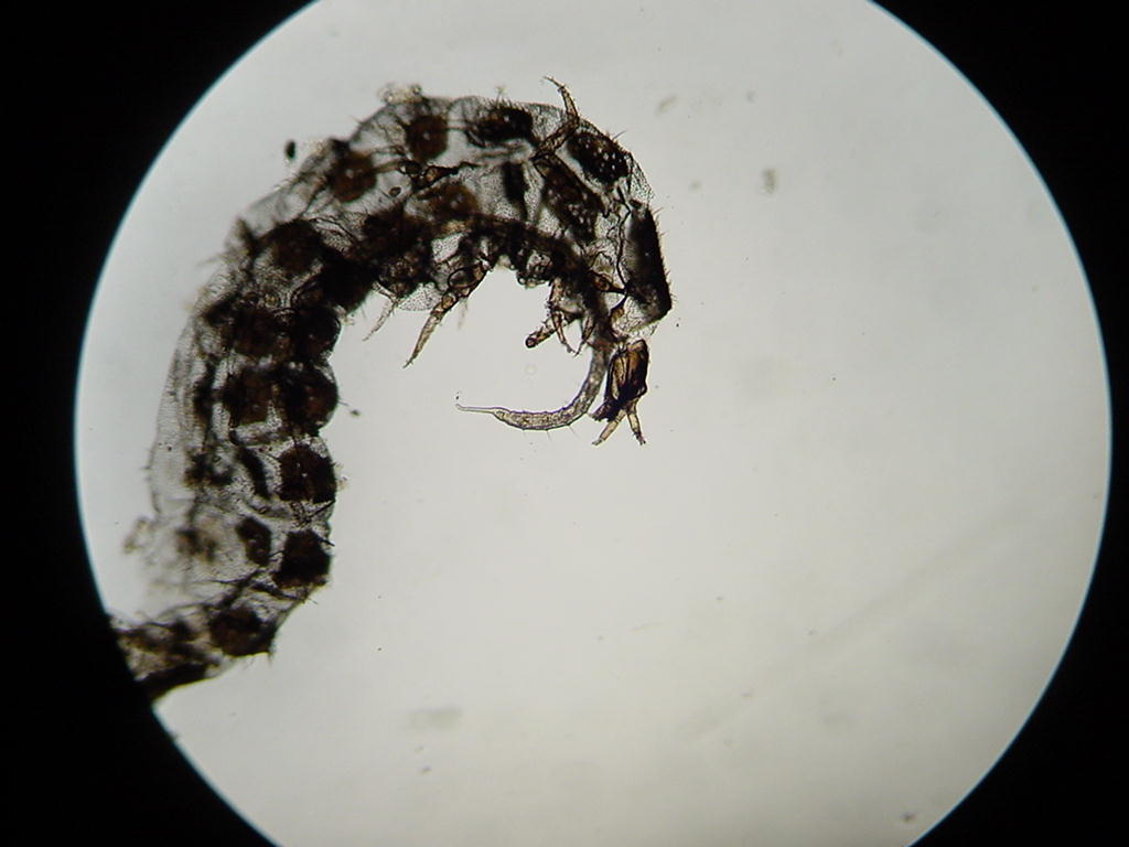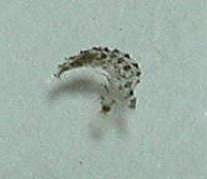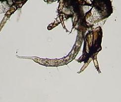に水中でフワフワ漂うようなものではない。形もしっかりしている。昨年までの観察ではこの状態から脱皮が始まった。予想通りその幼虫はわずかに動いていて体を曲げたり伸ばしたりしていたので、飼育槽からシャーレに移して観察を続けた。しかし、ルーペで動きを見ると脱皮のような動きではなかった。しばらくルーペでの観察を続けていると幼虫の体は脱け殻のようになってきて、その中には別の生物がいることがわかった。顕微鏡で見るとその様子がはっきりわかり、幼虫の体からその一部が出てくるときもあった。(下写真) |