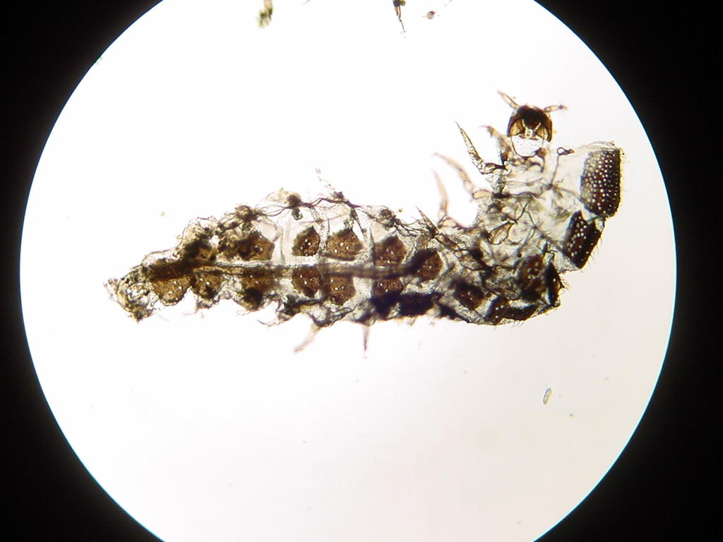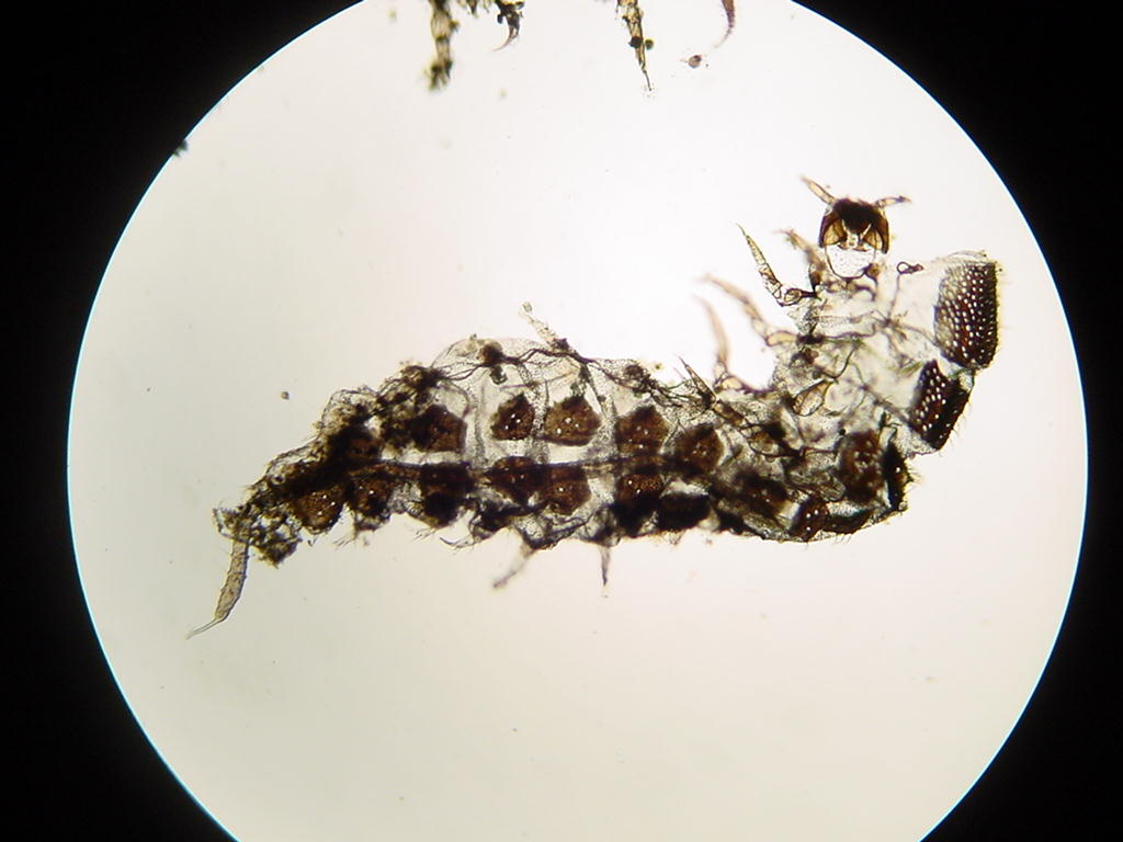 幼虫体内での生物の確認を終えて数時間後、再度スライドガラスを見るとその生物が抜け出していた。すでに水が乾いていたため死んでしまった状態であったが、その姿からアブラミミズの仲間に似た生物であることがわかった。この生物が原因で幼虫が死んでしまったのか、死んでしまった幼虫を食べていた生物なのか・・・・・?今のところ詳細は不明である。 |