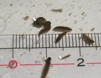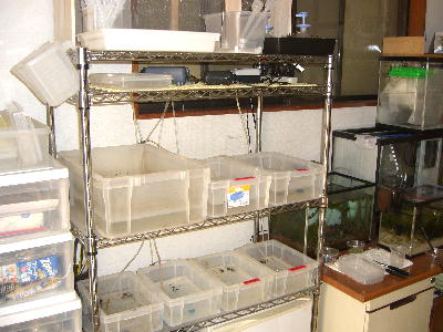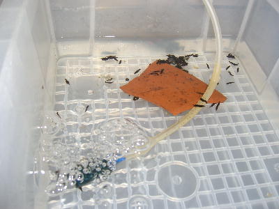 平成19年11月23日今年もエアレーションのみ の簡単な飼育槽で育てている。この方法は、水換えなどが面倒であるが、幼虫のようすをきちんと確認できるため、確実に育てるには一番良い。今年の夏は気温が高く、エアコンのない部屋での飼育は、水温調節などで苦労した。また、生まれたばかり小さな幼虫は、糞などの汚れと見分けがつかず、水換えも大変であった。 成育状況は順調である。しかし、この時期になると個体差が気になってくる。大きなものは、1cmを超えている。小さなものは、まだ3mm程度しかないため、今年も大きさ別に分けて飼育している。暖房器具は使っていない。気温がもう少し下がってきたら、水を温めて飼育する予定である。(「幼虫の食欲1」「幼虫の食欲2」参照 |
