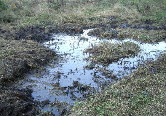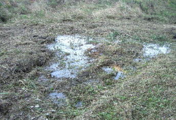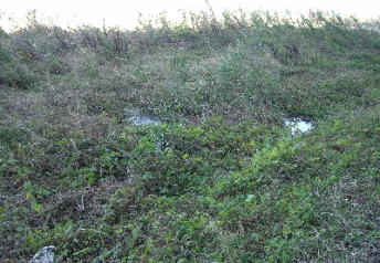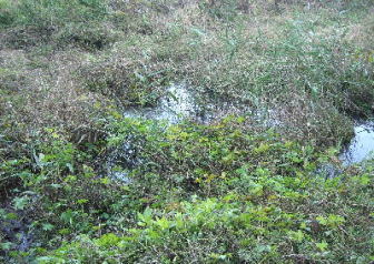 平成19年11月24日久しぶりに放流場所の草刈りを行った。ホタルのシーズン以降、一度も刈っていなかったため、水面が見えなくなるほど草が生茂っていた。投げ捨てられた空き缶などのゴミも多かった。 草刈りは機械を使ったが、刃の回転が止まってしまうほどカナムグラのつるが絡み付いてしまうため、予想以上に時間のかかる作業であった。 草刈後、池のようすを確認し、水溜りの部分を広くした。一度にたくさん広げてしまうと、たまっていた水が土中にしみ込んでしまうため、土の状態を見ながら少しだけ掘ってみた。(翌日に水がなくならないことを確認)ここは、水が流れないため、泥や落ち葉、枯草がたまり、ヘドロのようになってしまう。何とか流れをつくりたいと思うが、今のところ改善策は見つからない。 |