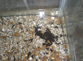 | 5月、幼虫を蛹化させるため、小屋の水路、羽化用水槽内、生息場所に幼虫放流(移動)した。 |