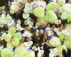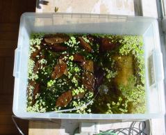 | モノアラガイの飼育槽。土、砂利、落葉、水草が入っている。濾過器は使わずに、エアレーションのみであるが、水は澄んでいる。 | 魚用の餌を与えると、そこにたくさん集まってくる。 | サカマキガイの卵。(魚を飼育している水槽の壁面の産みつけたものである。) |