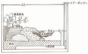 飼育環境カワニナにとって陸地は特に必要ないが、自然の雰囲気を出すためにつくった。 メダカも一緒に飼育。 |