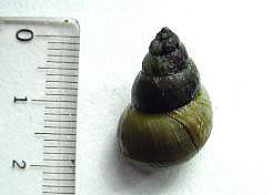 よく見かけるのは小型のヒメタニシである。殻高は30o前後で、殻の先が皮がはげているものが多い。雑食性で、水田や水路などの浅いところに棲んでいる。水質は比較的悪化しているところでも棲息できる。 ホタルに与える場合には、割って与えた方がよい。 |