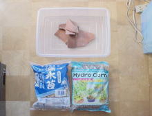 | @ 飼育容器内に園芸用発泡煉石(ハイドロコーン中粒)と水苔を使ってサンショウウオの棲み家を作る。 | ![]() |