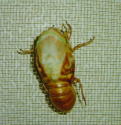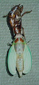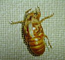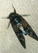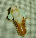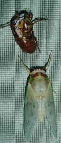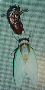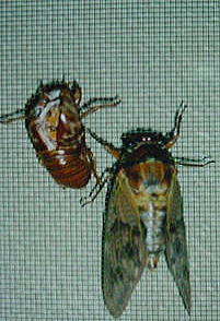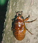 | 平成14年、今年の夏もたくさんのセミが鳴いています。我が家の庭でも夜間にたくさんのアブラゼミが羽化し、飛び立っていきました。ある日の夕方、ケヤキの木を登っていく幼虫を発見。羽化のようすを観察してみました。 |