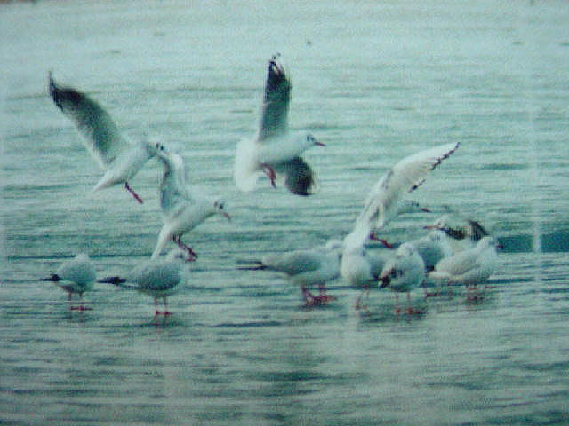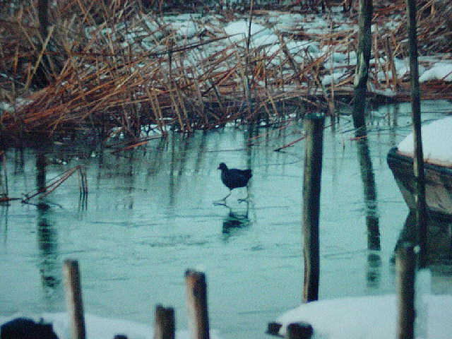 手賀沼の水面を歩く鳥がいた。手賀沼も凍結する日があり、水辺の鳥たちが湖上散歩を楽しんでいた。
