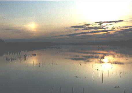 手賀大橋を我孫子から沼南町に向けて渡っていたときのことである。東の空を見ると太陽が空に2つ、手賀沼の湖面に2つ、合計4つも見えた。