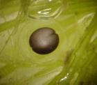 ![]() 産卵は、水草に後ろ足でしがみつくようにして行われる。オスはいつものように餌をほしがっていたが、メスは一日中この行動を繰り返していた。(右写真は、産み出された瞬間の卵) |