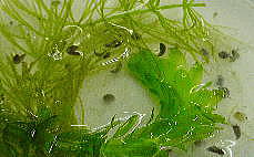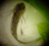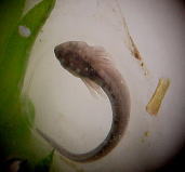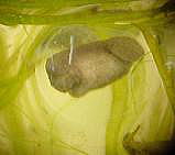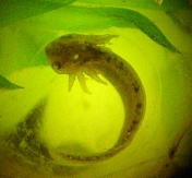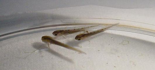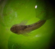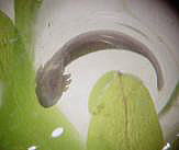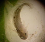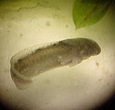 このころになると尾の部分が長くなり、肉眼でも肉眼でもアホロートルの幼生の形がわかるようになる。さらに鰓があらわれ、、2週間後には鰓の血管に血液が流れているのが確認できた。透明な殻の中で動くものもいる。水温は15℃前後である。この温度では低いためか、尾芽胚期に入ってからの成長が遅かったように思う。 |