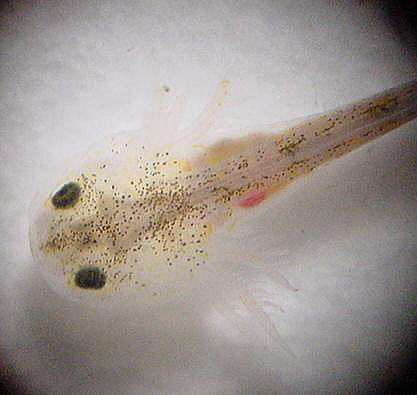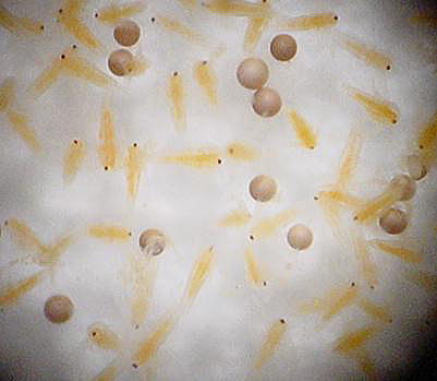 平成16年3月31日体長は約1.5pになり 、体色が薄くなってきた。拡大してみると、心臓の動きや消化器官に入った餌の様子を見ることができる。産まれたばかりのばかりの幼生には、ブラインシュリンプを与えている。 ブラインシュリンプは、与える前に食塩水に入れ、孵化させなければならない。 水500mlに食塩約10gを入れ、水温25℃前後の食塩水を作る。そこにブラインシュリンプの卵を0.8gを入れて孵化させる。エアレーションが必要。24時間前後で孵化する。 (右写真:孵化したブラインシュリンプ) |