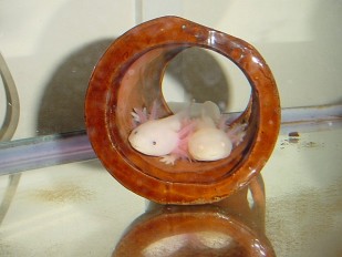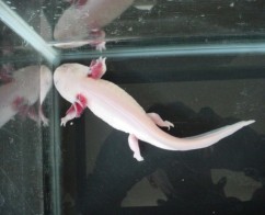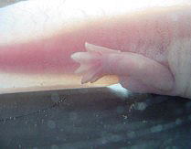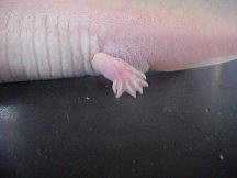 | 平成17年 1月26日 別の親のアホロートルを何気なく見ていたら、本来5本の後ろ足の指が6本あることに気づいた。アホロートルは怪我をしても再生する能力があるため、怪我の仕方によってはこのようになってしまうことも不思議ではないと思うが、初めて見る6本指の足である。 |