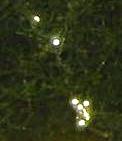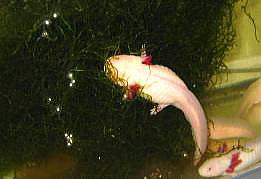 産卵が始まったのは、午前7:30頃である。アルビノ のアホロートル(昨年は他より産卵が遅かったもの)の落ち着きがなく、水槽の中を泳ぎ回っていた。その後、水草にしがみついて産卵を始めた。(写真の水草に付いている白色の粒が受精卵) その時の水温は13.5度であった。 |