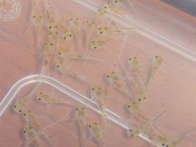 平成17年3月20日無事孵化が始まった。 これからブラインシュリンプを使った飼育が始まる。昨年は冷凍赤虫に移行する時期が遅くなってしまい、共食いによって数を大きく減らしてしまったので、今年は行動をよく観察しながら餌を選んでいきたい。 |