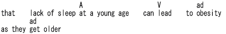 A study tracking children over several years indicates that lack of sleep at a young age can lead to obesity as they get older. 「長年にわたって子供を追跡調査した研究は、幼年期の睡眠不足が、年を取るにしたがって肥満につながりうるということを示している。」 |