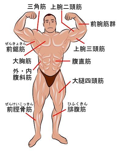 | 後は、団地を半周して帰宅するまでの10分間に、両腕・胸・背中・ 首などのストレッチを行います。家に着いたら下半身と腰のストレッ チをして、更に「青竹踏み」をして運動を終ります。運動の後は、活 性水素水の「日田天領水」に、「天然にがり」を少々加えたのをタッ プリと飲んで、水分とミネラルを補給しています。ここまでに出て来 た筋肉の名称が、身体のどの部分を示すのかお解りでない方は、下の 「筋肉図」をご参照下さいネ♪ |