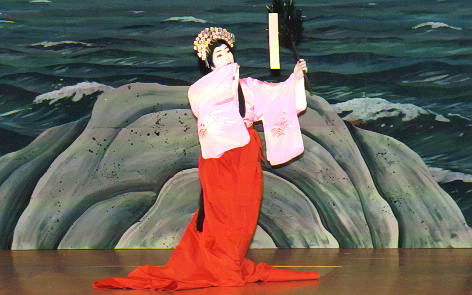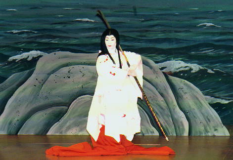 地に血糊の着いた衣装になり、岩組みの上で薙刀を担ぎ、桧扇をかざ
