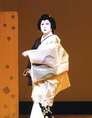 | 展示室8の常磐津「山姥」と同じテーマの作品ですが、地が長唄 なので、ドラマ性が薄い代りに、より華やかで艶やかな曲調に仕 上がっています。前半は「山めぐり」と言うより、嘗て遊女だっ た頃の廓の情景や心情の表現にポイントが置かれていて、「冬」 になってやっと「山姥」らしい雰囲気になります。「秋」の後、 二上りになってがらりと気分が変るんですが、踊っていてどうし ても気持ちが途切れてしまうので、僕はこの二上りの部分に抵抗 があったんです。(汗)たまたま長唄の方から、「この部分は初演 の時は無くて、後から挿入されたのだ」と伺ったので、今回は思 い切ってカットして演じました。本調子からいきなり三下りにな るので、やや重い感じにはなりますが、気持ちがスムーズに流れ ていく上に、上演時間もかなり短くなるので、これはこれでもよ かったんじゃないかと思っています。 |