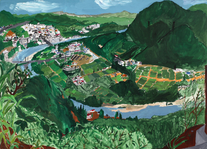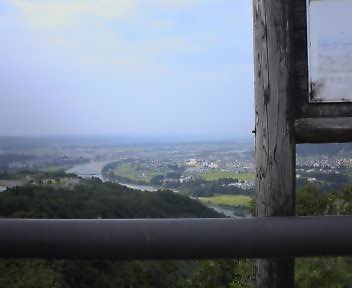 下に広がる信濃川と小千谷の町の風景。明るい緑の水田が絨毯のようで、とても美しかった。