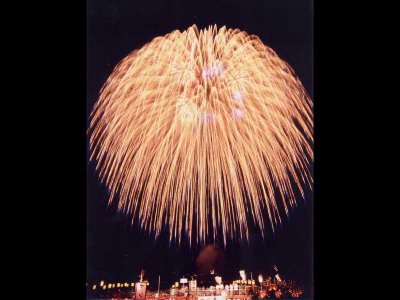 ちょうどついた頃、○洋電○の3尺玉で、桟敷の一番端の最前列で見ることができた。(○○ちゃん、アリガト)