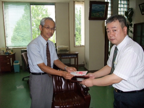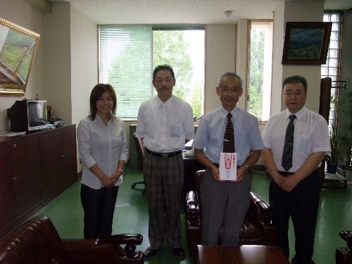 8月25日、中学校に行って寄付金を校長先生にお渡しします。