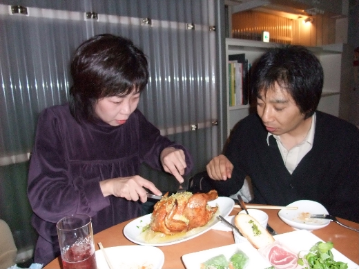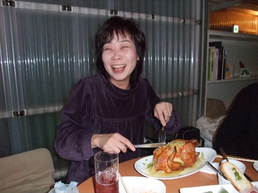 チキンきってるところの、ひろみ。珍しくめかしこんでる。