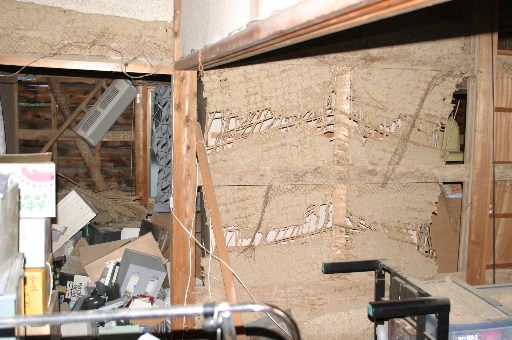 鏡は30度に傾き、棚の物は棚ごとすべて放り投げ出され、お店の床のCFの下は、亀裂が走り今もそのまま。
