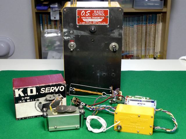 サーボとかアクチュエータとか物を動かす機械が好きです。K.O.のM-1サーボは初期のシングルラダー用サーボです。このギヤ剥き出しの外観がお気に入りなんですが、なかなか動かす機会がありませんでした。と云うのもどう見ても1950年代末の製品ですから、セットを作るにしても時代が合う送受信機がなかなかありません。今回はOSのジャンクをレストアして用意しました。送信機は2AP-2。ぼろぼろなんですが何とかレストアしました。受信機はARIST