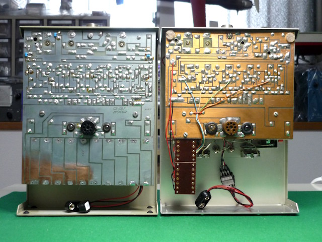 送信機の内部です。左のC&S DIGICONはプリント基盤上に電源のニッカド電池が実装されていました。20年前にレストアした時はオリジナル同様にニッカド電池を実装したんですが、20年経って電池が劣化してましたし、プリント基板触る時に危ないので今回外しました。