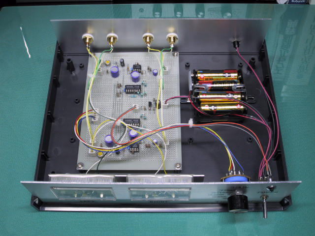美しく乱れたワイヤリング?。回路はラインアンプ、VUメータ駆動アンプとゲイン切り替えのアナログSWだけですから内部はすっからかんです。VUメータは昔、粗大ごみで捨ててあったカセットデッキから取り外した物です。消費電流は25mA弱ですので、単三アルカリ乾電池8本で3日連続ぐらいは動かせます。ラインアンプはアッテネータ+固定ゲインアンプが一般的ですが、良質のアッテネータは場所とコストがかさみますから、アンプのフィードバック抵抗をアナログSWで切り替えてゲインを切り替えています。ゲインは0,+6,+10,+14,+20dBの5ステップ。考えてみればこの方法だと、ゲインを変えると帯域も変わるので好ましくないのですが、オーディオの帯域内ではほぼ一定ですし切り替え回路が簡単なので採用しました。VUメータはVU表示なだけですが、1KHz 1mW 600Ω(約2.2Vp-p)で0VUとなるように調整してあります。だいたいこのメータでレッドゾーン(0VU+6dBまで)にぴょんぴょん針が動くぐらいが適当なレベル?です。